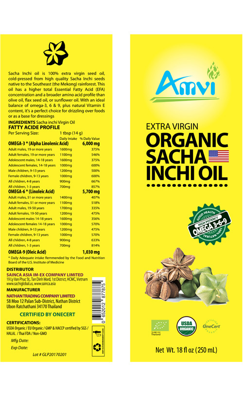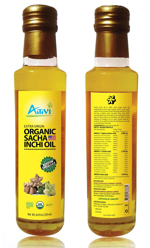 Dầu Sacha Inchi Extra Virgin được làm từ việc ép lạnh các hạt Sacha Inchi nguyên chất 100%, thỏa mãn các tiêu chuẩn Organic cho cây trồng tại các vùng mưa nhiệt đới Đông Nam Á. Với tổng lượng axit béo thiết yếu (EFA) cao hơn rất nhiều nếu so sánh với các loại dầu như: dầu olive; dầu từ hạt chia; dầu từ hạt hướng dương… với sự cân bằng lý tưởng của các Omega: 3,6,9 cộng với lượng Vitamin E tự nhiên, dầu Organic Sacha Inchi Extra Virgin là một chọn lựa tuyệt vời để bổ sung các chất dinh dưỡng cho bản thân và cả gia đình.